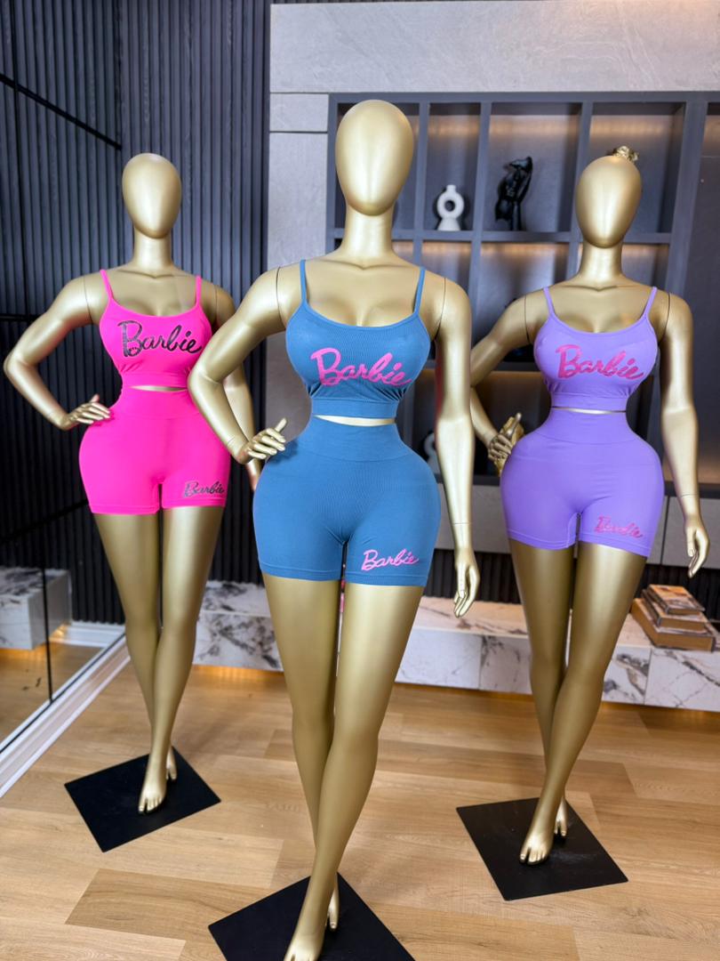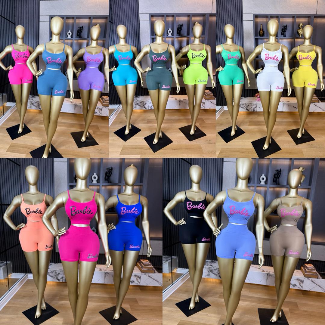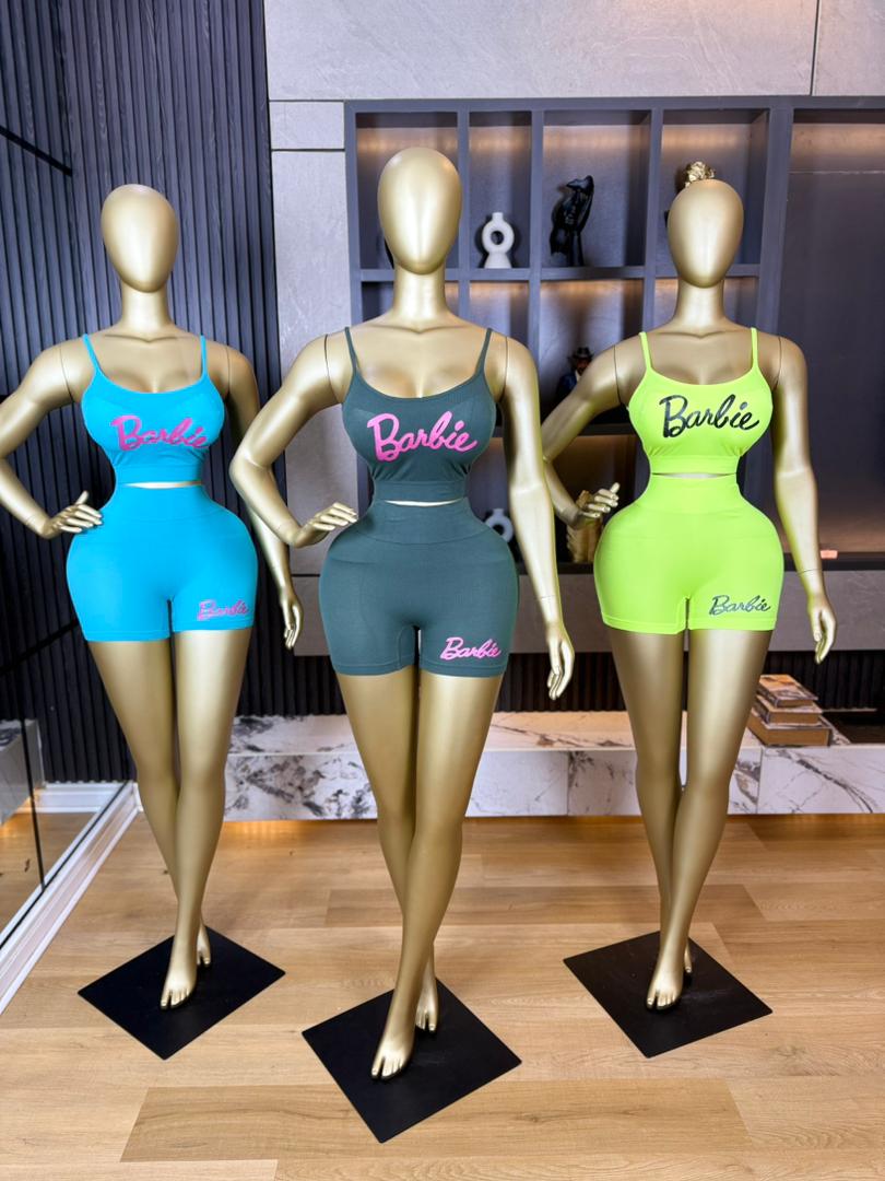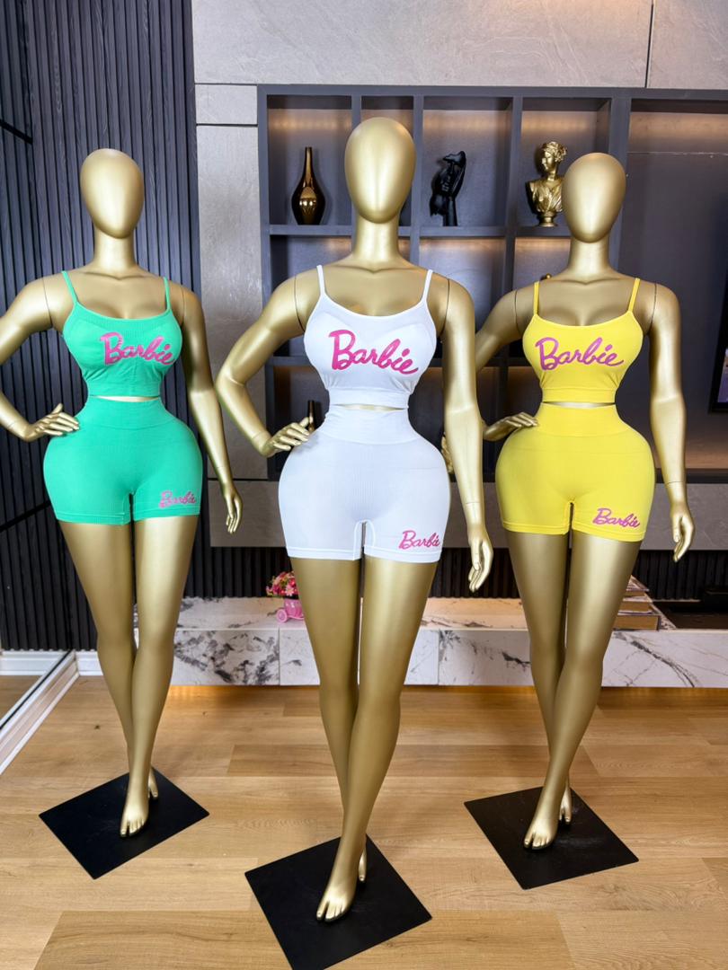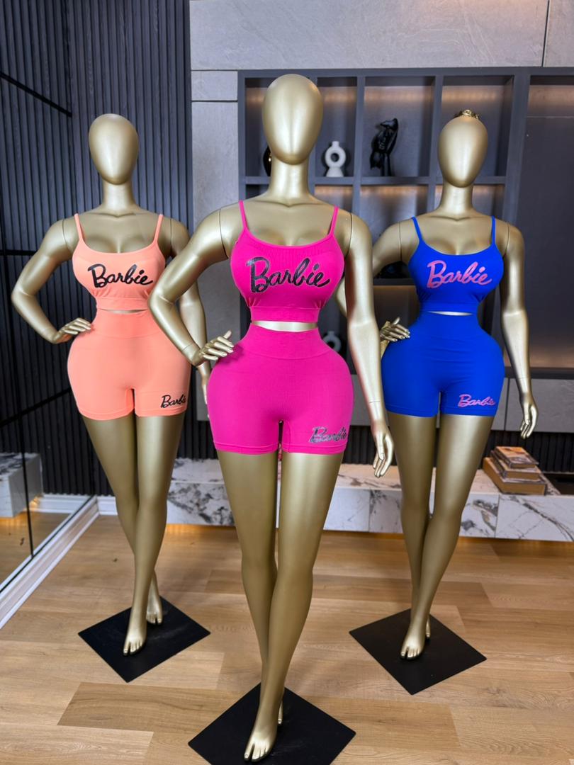 Fitted two-piece outfit, It features a cropped spaghetti-strap top with a scoop neckline and a high-waisted pair of mid-thigh shorts. The set is body-hugging, made from stretchy activewear-style fabric, and has a pink “Barbie” logo on both the top and shorts. It comes in black, light blue, and beige.