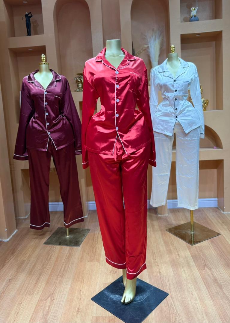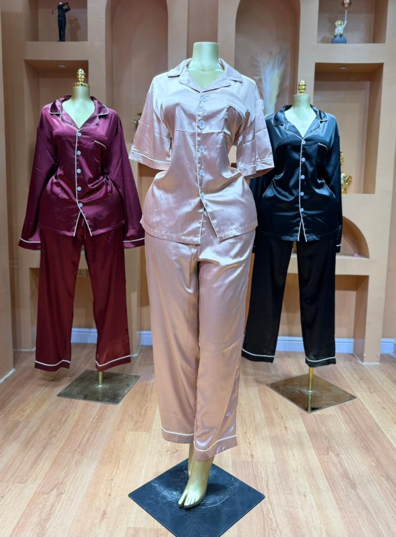 Women’s satin pajama set displayed on mannequins. The set includes a short-sleeve, button-down top with a notched collar and contrasting piping trim along the collar, button placket, sleeves, and pocket. The matching pants are full-length with a relaxed, straight-leg fit and matching piping detail along the hem.