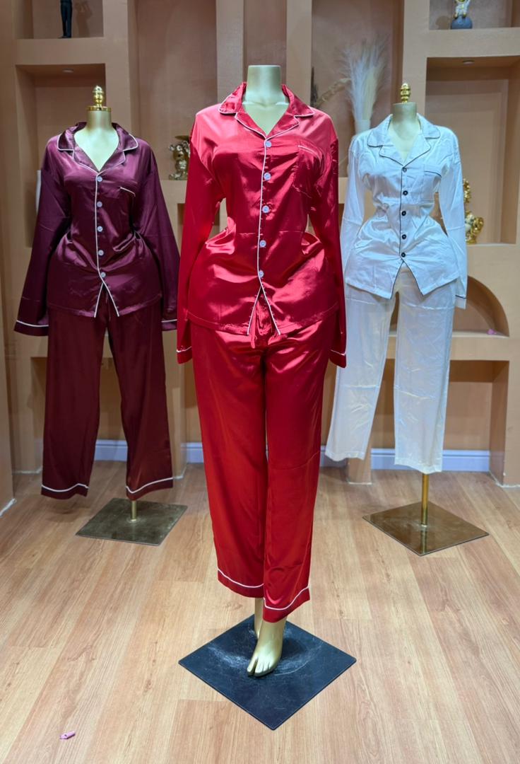 The fabric appears smooth and glossy, giving it a soft, silky look and feel. The fit is loose and comfortable, designed for sleepwear or lounging. The sets are shown in three colors: blush pink (center), deep burgundy (left), and black (right).